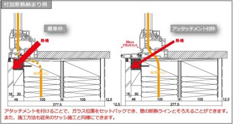 高断熱住宅化が進む、住宅建築において、窓の納まりも多様化しています。K-WINDOWは、数種のネイルフィンとアタッチメントを組合わせて、多彩な納ままりに対応できます。通常のサッシと同様に取付けでき、止水処理も同様にできるため、施工性も良く、施工不良が起きにくい納まりになっています。